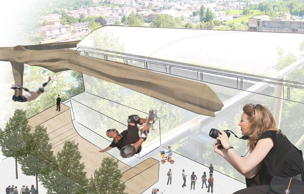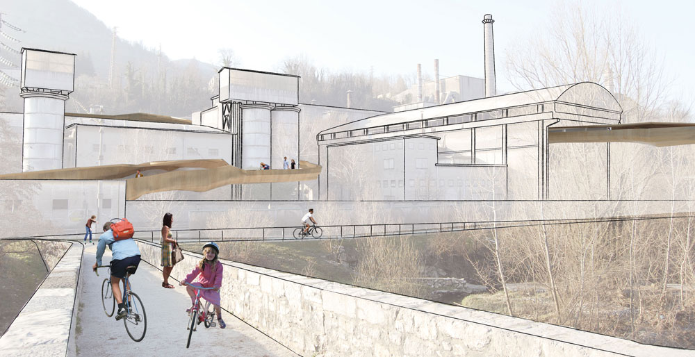 Il progetto consiste nella realizzazione di un nastro ciclopedonale che collegandosi alla pista ciclabile adiacente il fiume, innestandosi alla medesima quota, sale fino ad una quota di circa 10m, attraversa il ponte carrabile, il fiume stesso e penetra nel primo, più grande e preminente edificio presente nell’area dell’ex Cementificio Italcementi Guffanti. All’interno del progetto il nastro si propone come un’arteria che pulsa e trasmette nuova vitalità, come l’elemento architettonico che crea unione ed esalta il sito e le nuove funzioni. Penetra, avvolge, collega e si modifica continuamente nella sezione man mano che procede verso l’interno.